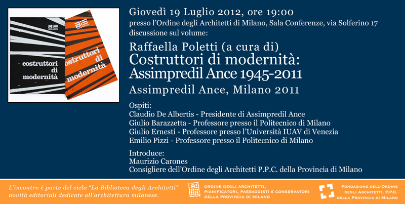 Giovedì 19 Luglio alle ore 19 presso l'Ordine degli Architetti di Milano si svolgerà un incontro dedicato al libro "Costruttori di Modernità. Assimpredil Ance 1945-2011" edito da Assimpredil Ance e curato da Raffaella Poletti.